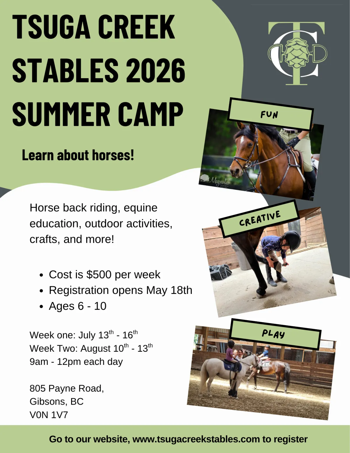 Each camp day will run from 9am - 12pm, and costs $500 per week. For ages 6 - 10.